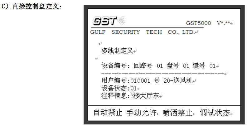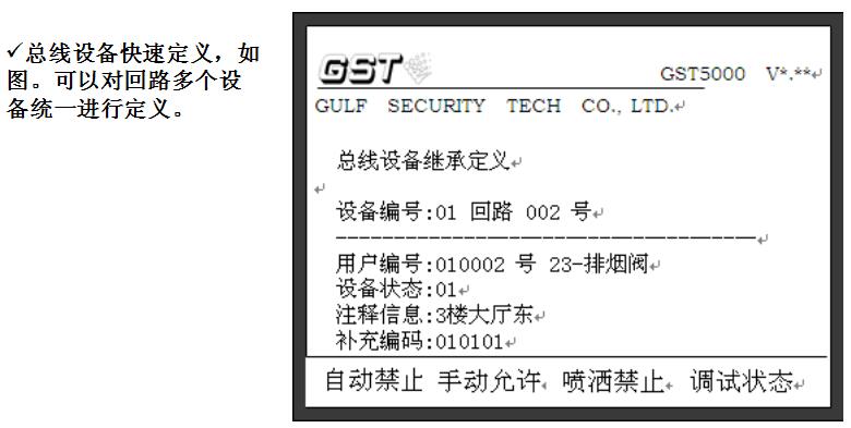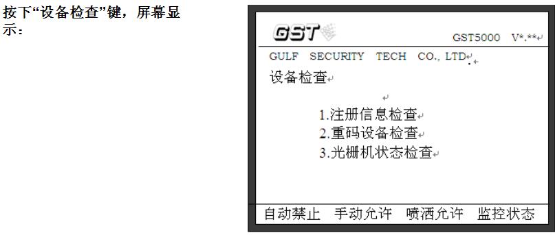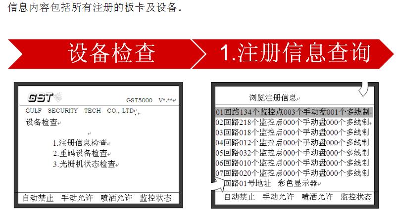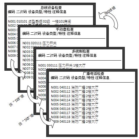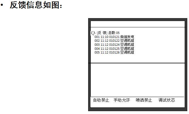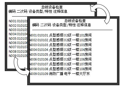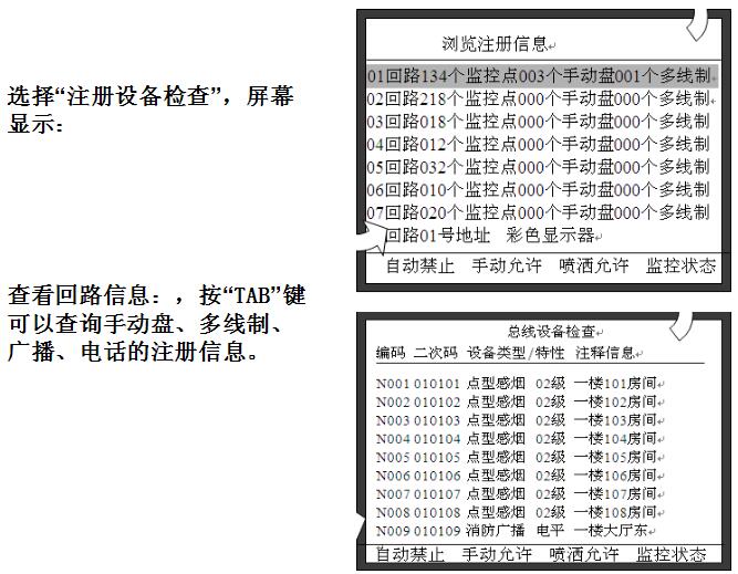 选中某一回路,按下“确认”键,将显示这一回路注册到的各设备的信息,-上一行的设备高亮显示;按任意数字键高亮消失,控制器处于总线设备检查状态